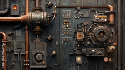 Industrial Control Panel with Pipes, Gauges, and Vintage Technology