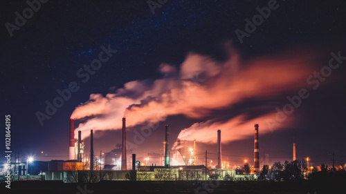 Industrial district at night with glowing smokestacks and vibrant skies