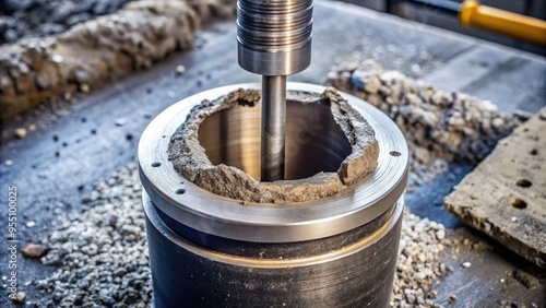Industrial drill bit with a hollow core extracting a cylindrical sample of concrete or asphalt for laboratory testing or analysis of physical properties.