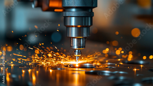 industrial drilling machine with precision metal drill bit creating sparks highlighting the power and strength of machinery symbolizing human ingenuity and advanced manufacturing technology
