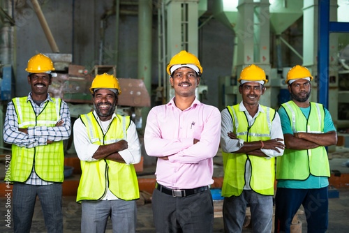 industrial employees with crossed arms standing by looking camera at factory - concept of leadership, successful workers and workforce.