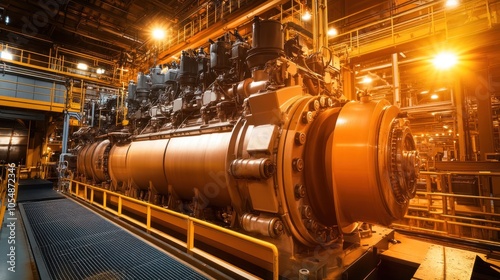Industrial engine room interior. Industrial power plant main generator with enormous diesel engine. high voltage industrial diesel generator at a power generation plant