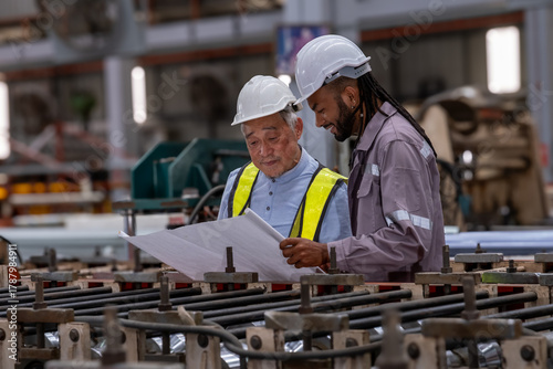 Industrial Engineer in Hard Hats.Work at the Heavy Industry Metal Sheet Manufacturing Factory. Factory worker indoors in metal sheet factory. Man working in an industrial factory.
