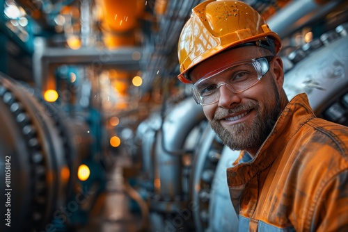 Industrial engineer in high visibility jacket and hard hat standing in a large plant facility with warm lighting