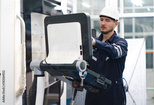 Industrial engineer operating modern CNC milling machine at a metalworking factory. Metalwork technician working with skill on accurate, precision automated machinery in lathe or cut steel. copy space
