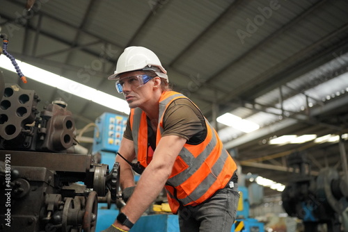 Industrial Engineers in Hard Hats.Work at the Heavy Industry Manufacturing Factory.industrial worker indoors in factory. man working in an industrial factory.