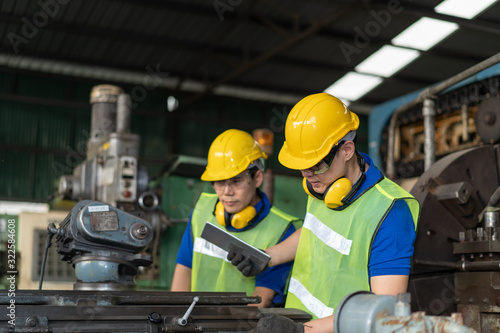 Industrial engineers in safety uniforms wearing yellow safety helmets are inspecting work by tools. and on the job training he works in industrial machinery.
