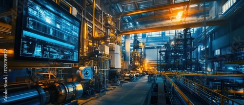 Industrial facility showcasing advanced machinery and illuminated equipment during night operations in a manufacturing plant