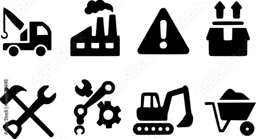 Industrial flat icon set in black and white style | factory, tools, machinery, engineering symbols.
