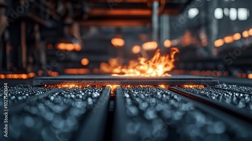 Industrial furnace blazing with fire, intense heat inside a metallurgy factory, metalworking process, steel production, glowing flames in a heavy industry environment