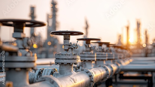 Industrial Gas Pipeline with Valves at Sunset in a Modern Refinery Setting