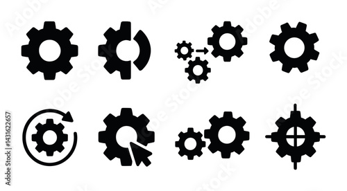 Industrial gear silhouette icons set – solid style machinery, engineering, and automation symbols: cogwheel, gear, machinery, settings, automation, mechanical, industry.