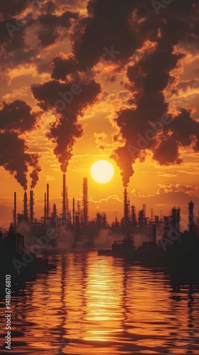 Industrial Landscape at Dusk with Factory Chimneys, Heavy Smoke, and Golden Water Reflection