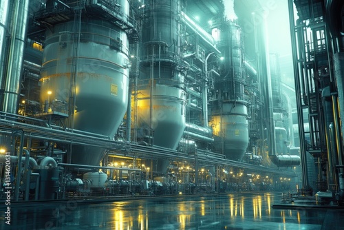Industrial landscape: Teal and yellow toned factory interior with reflective floor