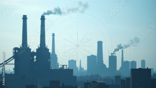 Industrial landscape with silhouetted buildings, angular lines, and digital diagrams