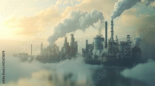 Industrial landscape with smoke and factories reflecting on water during sunrise, showcasing the impact of pollution and industry.