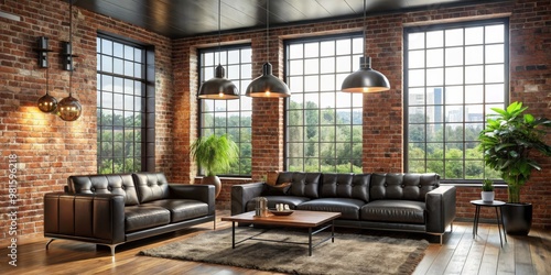 Industrial Loft Living Room with Leather Couches and Brick Walls, interior design, loft, living room