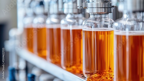 industrial machinery and production line mechanized. Bottles of amber liquid lined up on a production line.