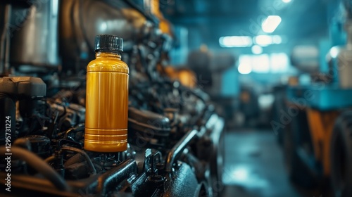 Industrial maintenance action oil bottle positioned on engine components in workshop environment detailed close-up perspective for technical insights