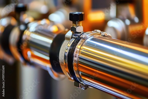 Industrial Metal Pipe System Closeup Polished Chrome Steel Hydraulics Technology