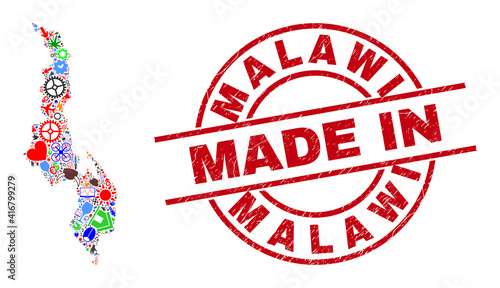 Industrial mosaic Malawi map and MADE IN grunge stamp. Malawi map collage composed with wrenches, wheels, instruments, items, vehicles, electricity strikes, rockets.