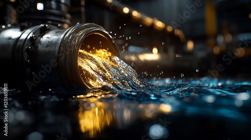Industrial pipe spewing liquid with golden light creating abstract pattern of liquid