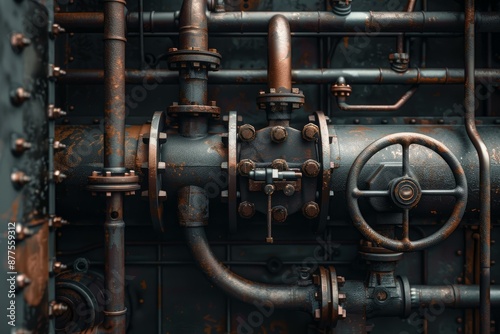 Industrial pipeline system with many rusty valves and pipes connecting
