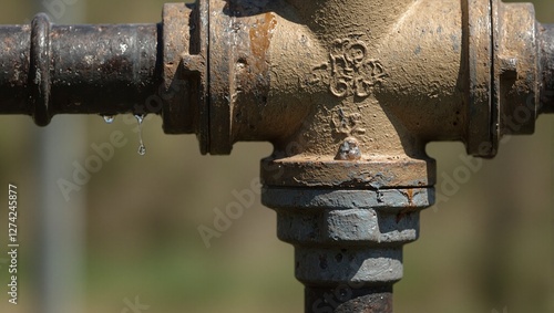 Industrial pipeline valve with brass and steel components oil droplet glistening in sunlight