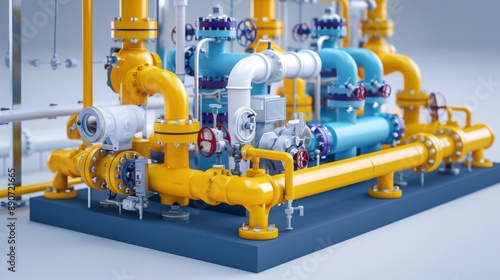 Industrial pipelines with valves and fittings, showcasing complex engineering and modern technology for fluid management systems.