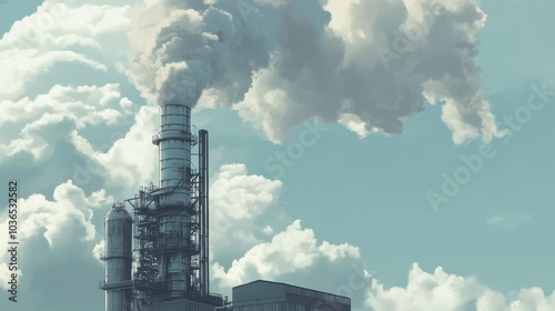 Industrial plant emissions under a cloudy sky, representing the environmental impact of chemical production.