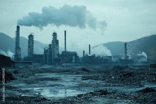 Industrial Plant Pollution Amidst Misty Mountains.
