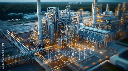 Industrial Plant with Virtual Twin Showcasing Key Performance Metrics and Maintenance Schedules