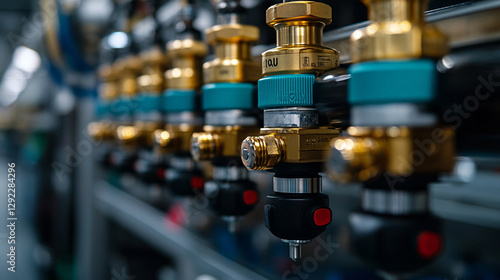 industrial pneumatic tools, showcasing precision, technology, and efficiency in a manufacturing setup with visible hoses and valves, highlighting advanced machinery in a modern, bright environment