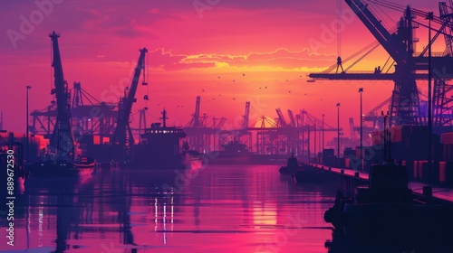 Industrial port at dusk, vibrant colors, silhouettes of cranes and ships, calm water