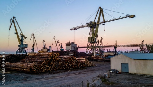 Industrial Port with Cranes Overlooking Timber Stack at Sunset