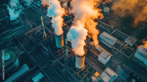 Industrial power plant from above with vibrant steam rising from cooling towers, creating a dynamic contrast between technology and nature