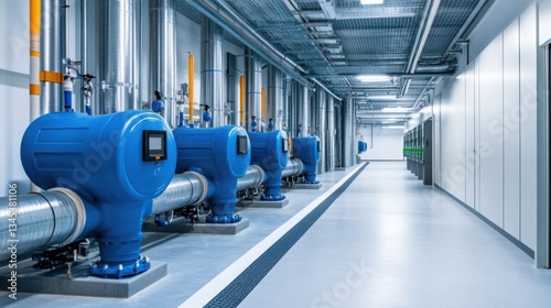Industrial Pumping Station Interior with Blue Pumps and Modern Infrastructure in a Bright Environment