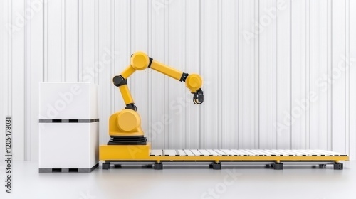 Industrial Robot Arm Handling Package on Conveyor in Modern Warehouse Environment
