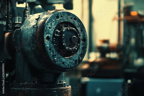 Industrial robot in manufacturing plant with harsh lighting and copy space above