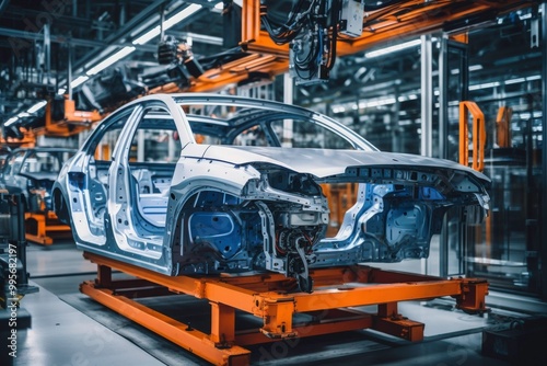 Industrial robots precisely weld car bodies on assembly lines. Suitable for manufacturing, robotics, automation, automotive industry presentations. Generative AI