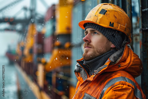Industrial safety and shipping logistics with Depict workers ensuring industrial safety while managing shipping logistics, with safety gear, containers, and transportation elements prominently