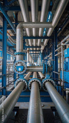 Industrial scene with large metal pipes running between factory buildings, conveying a sense of heavy industry and infrastructure.