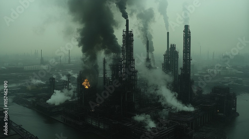 Industrial Smog: A Dark Aerial View of a sprawling industrial complex shrouded in thick, dark smog, highlighting the environmental consequences of heavy industry.