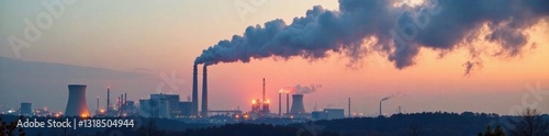 Industrial smokestacks emit thick grey mist, smoke, industry, pollution