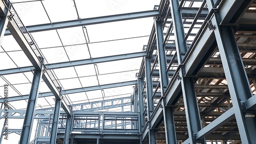 Industrial steel frame structure in progress, showcasing clean architectural lines and soft natural lighting.