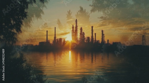 Industrial sunset reflection over water oil refinery nature photography calm environment wide angle contrast of industry and nature