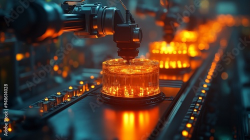 Industrial Symphony: Robotic arms orchestrate molten glass on a vibrant, futuristic assembly line.