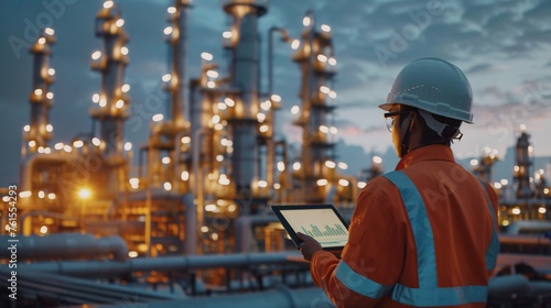 Industrial tech master overseeing with a white safety helmet in front of an oil refinery. Petrochemical gas industry zone. Oil storage tanks and pipelines. Worker in the refinery. ai generative