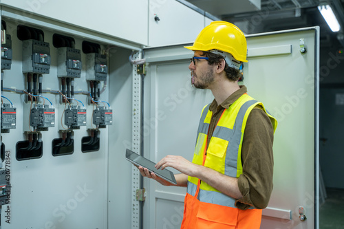 Industrial technician check voltage or current status in control panel of power plant electrical energy distribution substation in factory.