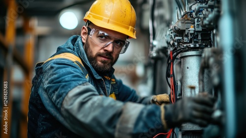 Industrial technician operating machinery in safety gear at manufacturing facility
